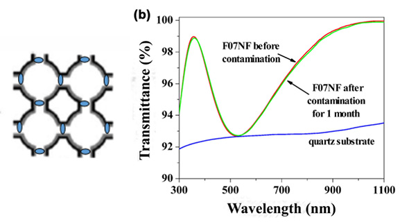 针对恶劣环境使用的减反膜,使用超低表面能材料封堵减反膜中的有序孔道,在保证光学性能的前提下,对水和油污的疏离性质同步提高,实现抗污染使用,透射率可以长期保持99%以上。